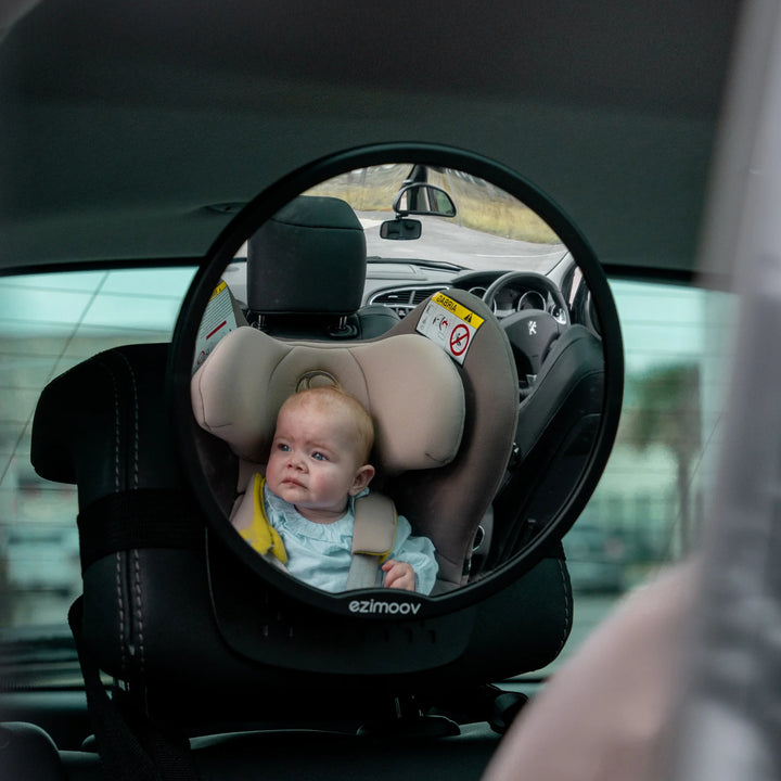 The Ezimoov Round Mirror is a large, slightly curved mirror designed to attach to your back seat headrest, allowing you to easily monitor your child without turning around—just check your rear view mirror.