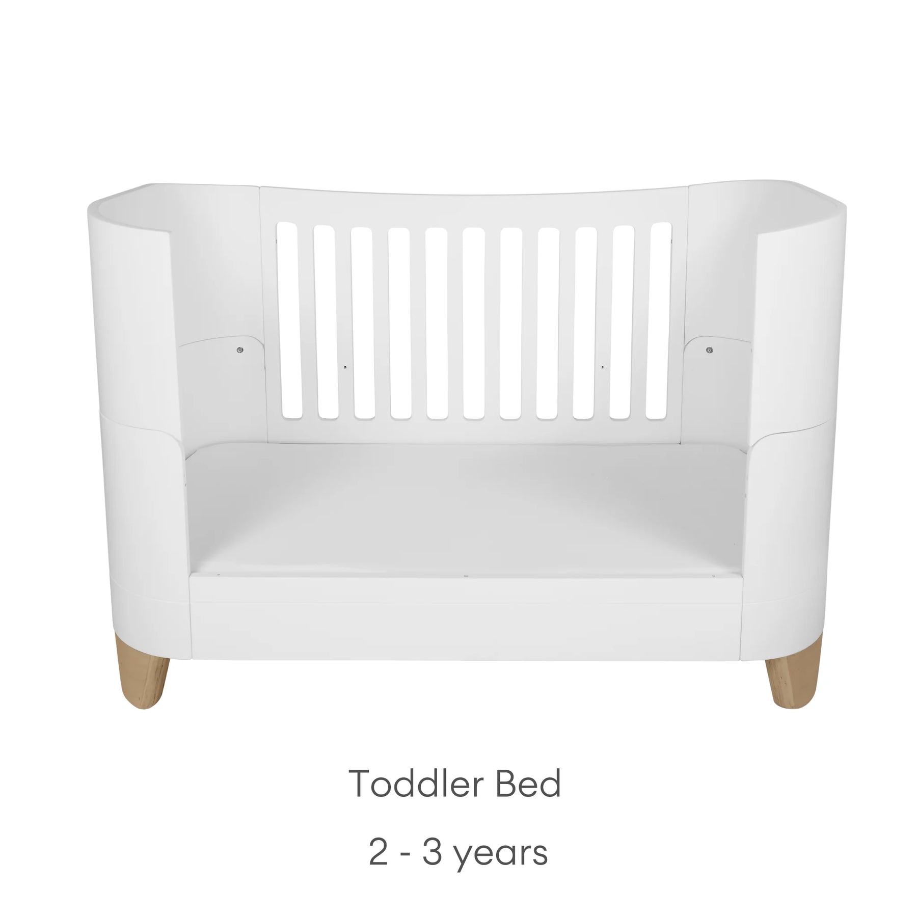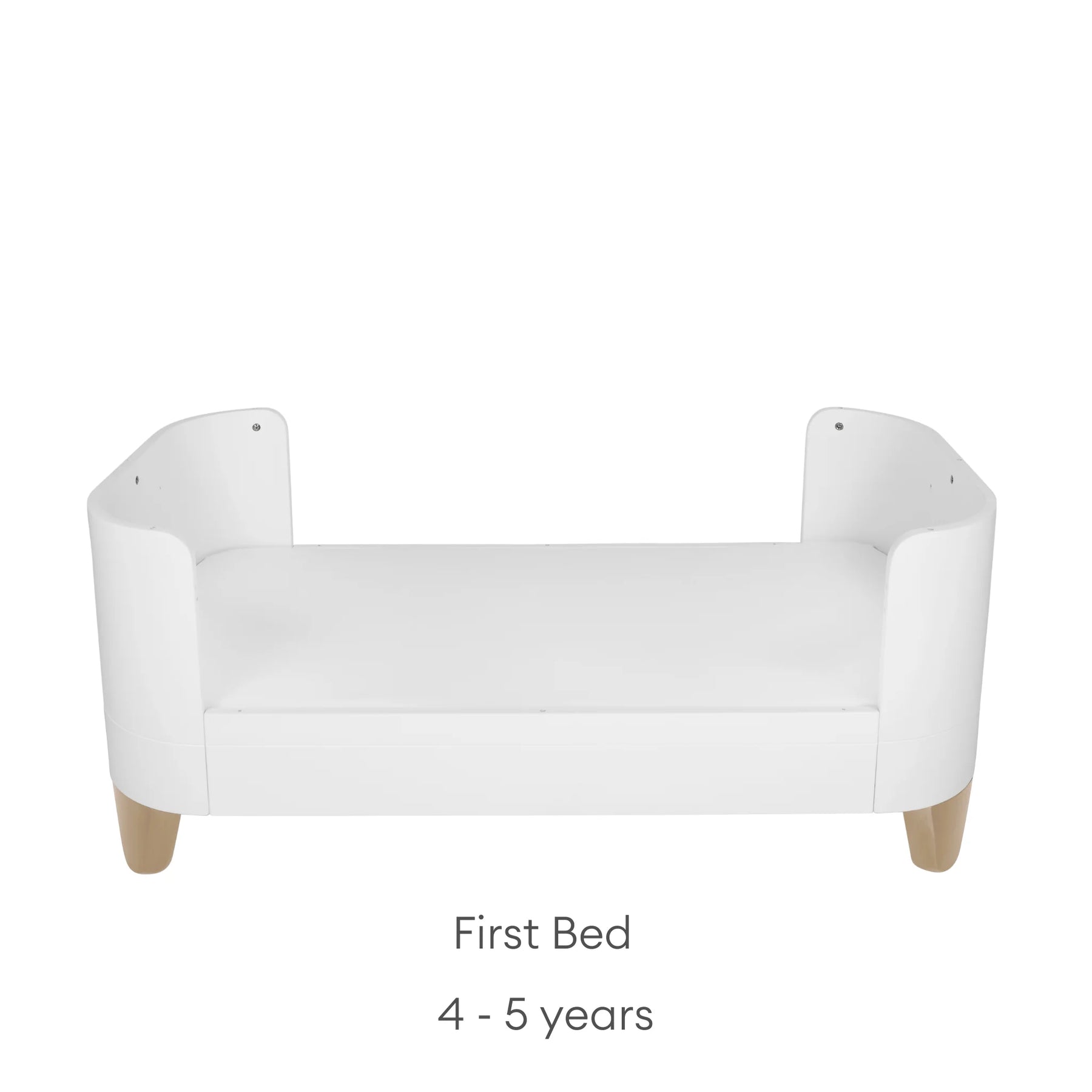 The Serena Cot Bed grows with your child from birth to 5 years old. The 100% natural wood Serena Cot Bed easily converts through 4 stages: newborn cot, cot bed, toddler bed and first bed. You can also extend the life of your Cot Bed with the Junior Bed extension Kit (sold separately) for kids up to 7 years.