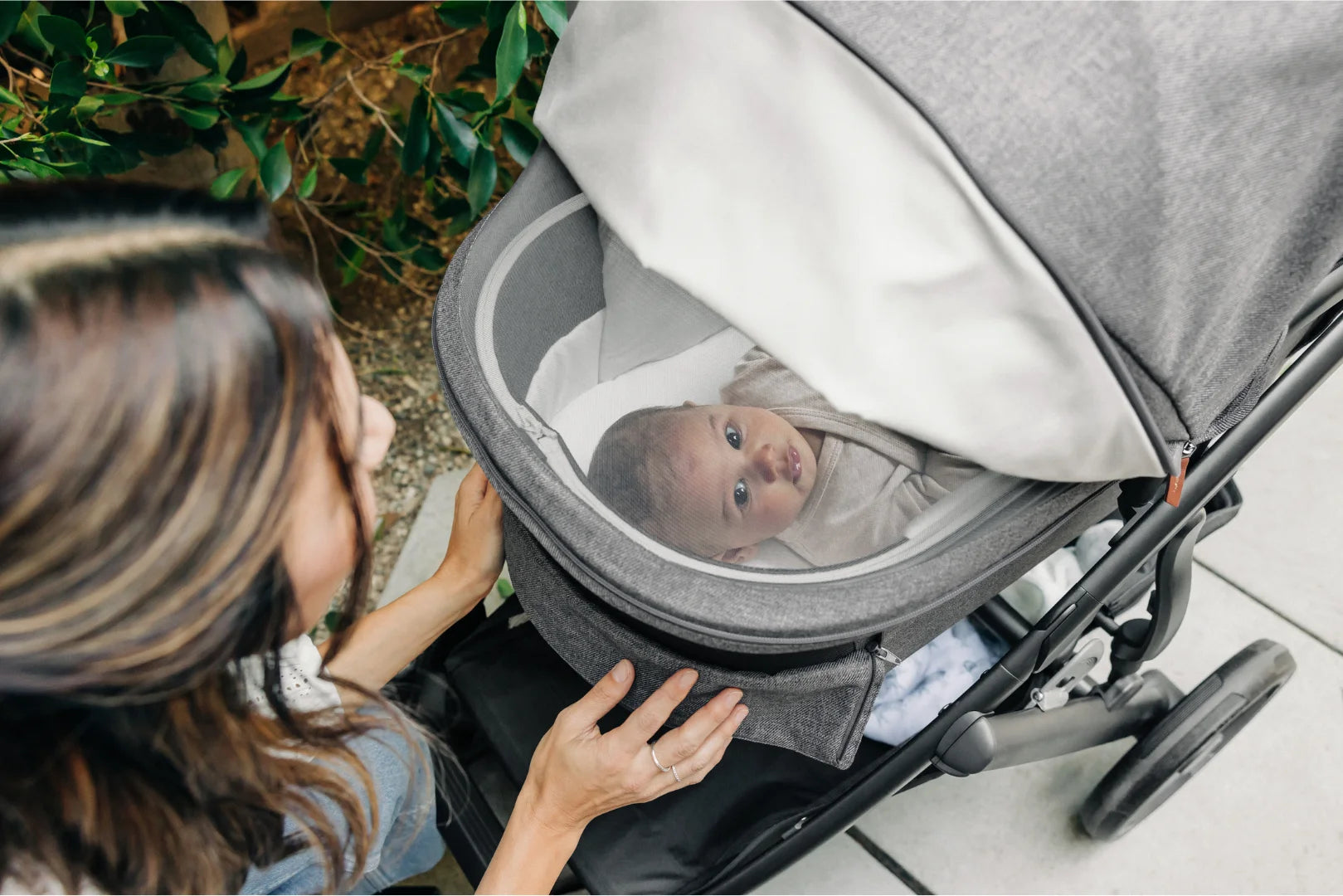 A dual zipper feature on the bassinet boot cover easily opens and closes for quick access to your cutie. Plus, the convenient carry handle offers an effortless one-hand, one-button stroller release for easy on-and-off attachment when you want to go from stroll to stand.