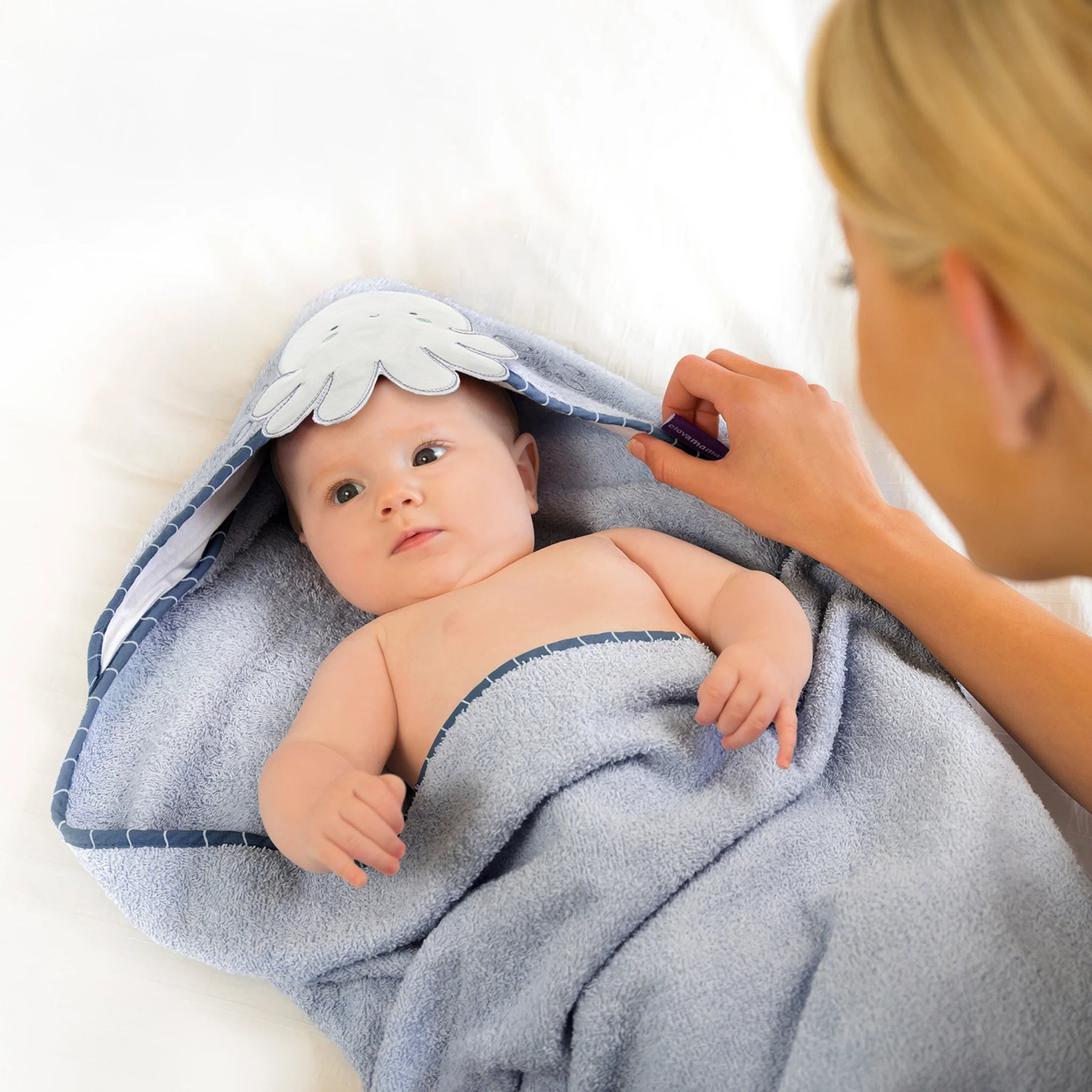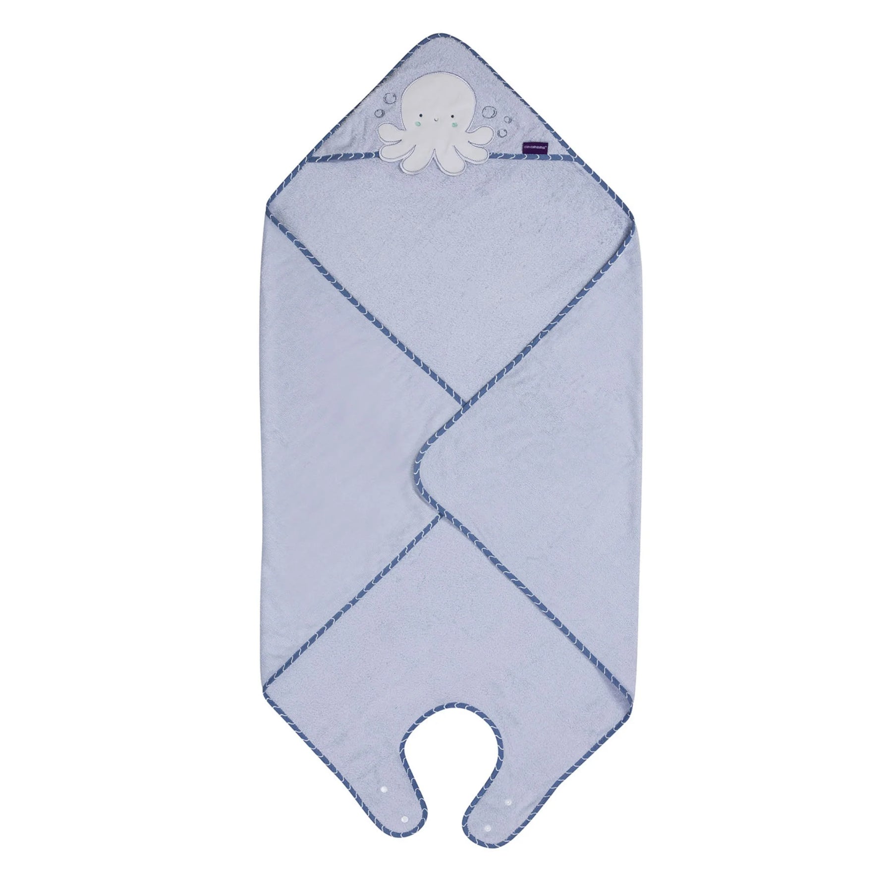 The towel fastens around your neck like an apron, allowing you to keep your hands free while bathing your baby for safer lifting and drying.